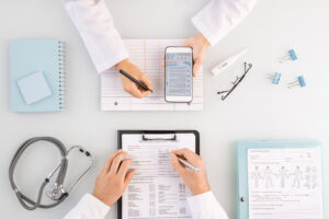 Clinicians filling in medical history form, making notes and using smartphone